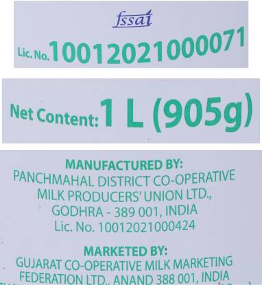 | Packed by: | Kaira District Co-operative Milk Producers' Union Limited, Amul Dairy, ANAND |